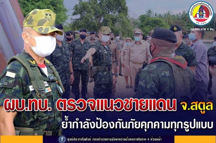 พลเอก ณรงค์พันธ์ จิตต์แก้วแท้ ผู้บัญชาการทหารบก กล่าวว่า เดินทางมาตรวจชายแดนวันนี้มาดูมาตรการต่าง ๆ โดยเฉพาะมาตรการป้องกันชายแดน ซึ่งภารกิจของกำลังป้องกันชายแดน นอกจากจะดูแลแนวชายแดนในเรื่องของการป้องกันภัยด้านความมั่นคง อย่างยาเสพติด หรือการลักลอบเข้าเมืองโดยผิดกฎหมายแล้ว ปัจจุบันประเทศเราต้องเผชิญกับภัยคุกคามอีกอย่างที่สำคัญ นั่นคือภัยจากโรคระบาดโควิด-19 ซึ่งที่ผ่านมาประเทศไทยถือเป็นประเทศที่มีการป้องกันการระบาดของโรคได้อย่างมีประสิทธิภาพเป็นที่ยอมรับของประเทศต่าง ๆ ทั่วโลก เพราะฉะนั้นกำลังป้องกันชายแดนถือเป็นกำลังสำคัญที่จะต้องเข้าไปช่วยเหลือดูแลเรื่องดังกล่าว เพราะเป็นด่านแรกที่สกัดกั้นไม่ให้เชื้อลักลอบเข้าสู่ประเทศของเราโดยไม่ผ่านกระบวนการคัดกรองได้ เพื่อสร้างความเชื่อมั่นและอุ่นใจให้แก่ประชาชน โดยเฉพาะที่ จ.สตูล ถือว่าเป็นจุดสำคัญของชายแดน เนื่องจากมีพื้นที่ติดต่อกับประเทศเพื่อนบ้านทั้งทางบกและทางน้ำ สามารถลักลอบเข้ามาได้หลายช่องทาง แต่ที่นี่ประชาชนมีความเข้มแข็ง ตระหนักและมีความเข้าใจในเรื่องโควิด-19 อย่างมาก พร้อมให้ความร่วมมือกับเจ้าหน้าที่เป็นอย่างดี ทั้งการช่วยเป็นหู เป็นตา เฝ้าระวังหมู่บ้านชุมชนของตน และเป็นสิ่งที่น่าดีใจ คือ ทุกภาคส่วนได้ให้เห็นความสำคัญและร่วมมือกัน โดยเฉพาะประชาชนในพื้นที่ ทำให้พื้นที่ชายแดนทางด้านนี้สามารถควบคุมสถานการณ์ได้ดี ถือเป็นโมเดลที่จะสามารถนำไปปรับใช้กับชายแดนด้านอื่น ๆ ได้ต่อไป