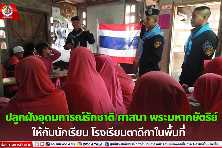 หน่วยเฉพาะกิจกรมทหารพรานที่ 30 จัดกำลังพล ชุดปฏิบัติการเสริมสร้างความเข้าใจของหน่วย เข้าพบปะพัฒนาสัมพันธ์กับ คณะครู/นักเรียน โรงเรียนตาดีกา ณ ศูนย์การศึกษาอิสลามประจำมัสยิดโต๊ะปาแวดารุสซานียะ หมู่ที่ 10 บ้านโต๊ะปาแว ตำบลตลิ่งชัน อำเภอบันนังสตา จังหวัดยะลา พร้อมจัดกิจกรรมให้ความรู้ ความเป็นมา เรื่องสี และความหมายของธงชาติ เพื่อปลูกฝังอุดมการณ์รักชาติ ศาสนา พระมหากษัตริย์ เพื่อให้นักเรียน นักศึกษา มีความรู้และความเข้าใจเกี่ยวกับสถาบันพระมหากษัตริย์ สร้างการรับรู้ ความตระหนักและสำนึกในพระมหากรุณาธิคุณของสถาบันพระมหากษัตริย์ อีกทั้งยังเป็นการสร้างภาพลักษณ์ที่ดี สร้างความสัมพันธ์อันดีระหว่าง เจ้าหน้าที่รัฐ กับคณะครูและนักเรียน
