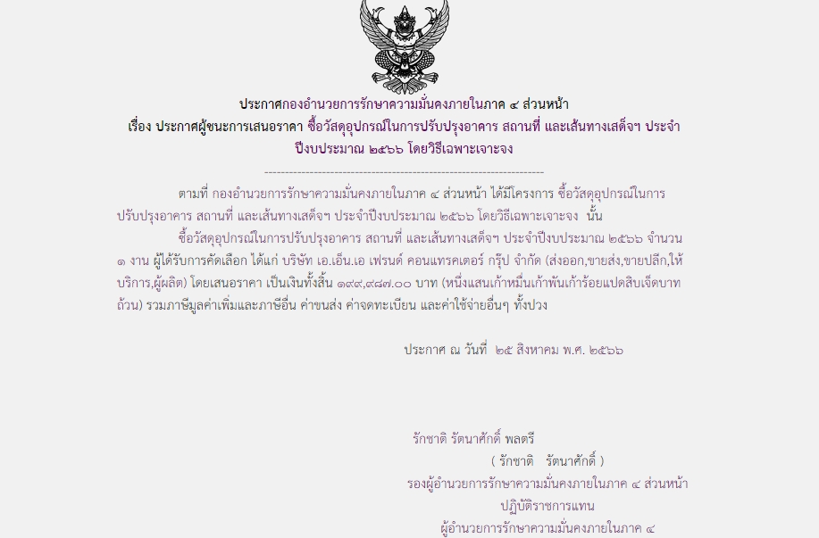 จัดซื้อ จัดจ้างประกาศผู้ชนะการเสนอราคา ประกาศผู้ชนะการเสนอราคา ซื้อวัสดุอุปกรณ์ในการปรับปรุงอาคาร สถานที่ และเส้นทางเสด็จฯ ประจำปีงบประมาณ ๒๕๖๖ โดยวิธีเฉพาะเจาะจง September 11, 2023 286 Share Facebook Twitter Google+ Telegram LINE