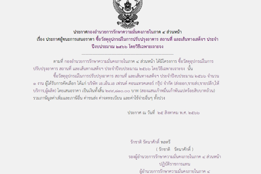 จัดซื้อ จัดจ้างประกาศผู้ชนะการเสนอราคา ประกาศผู้ชนะการเสนอราคา ซื้อวัสดุอุปกรณ์ในการปรับปรุงอาคาร สถานที่ และเส้นทางเสด็จฯ ประจำปีงบประมาณ ๒๕๖๖ โดยวิธีเฉพาะเจาะจง September 11, 2023 307 Share Facebook Twitter Google+ Telegram LINE
