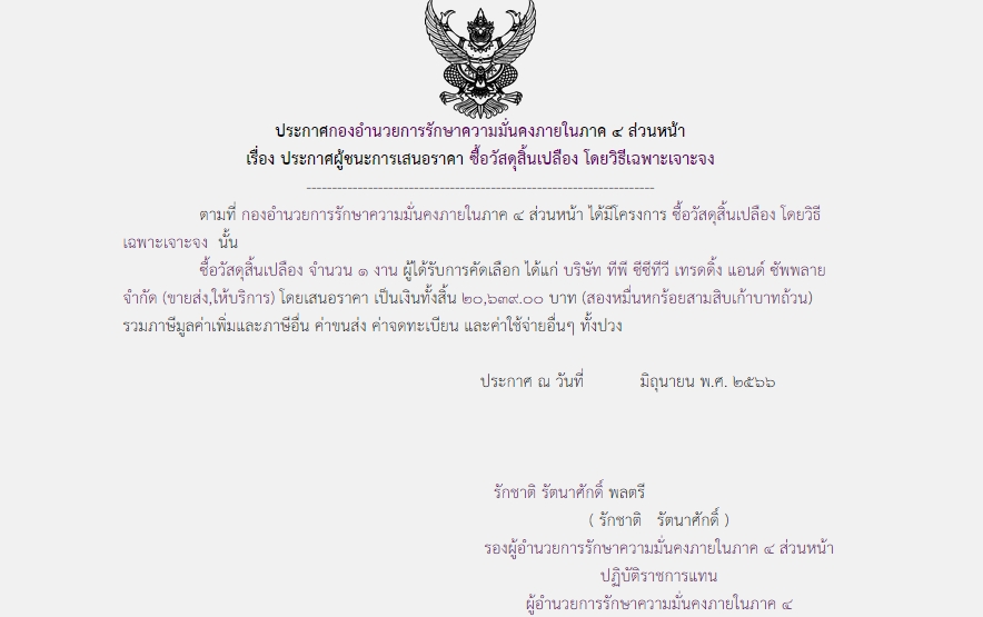 ประกาศผู้ชนะการเสนอราคา ซื้อวัสดุสิ้นเปลือง โดยวิธีเฉพาะเจาะจง