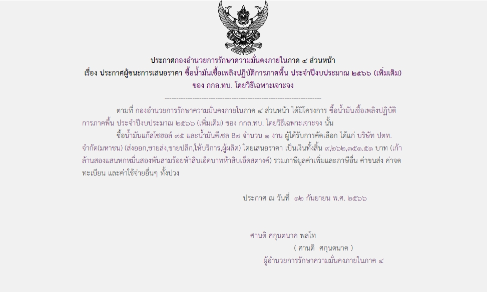 จัดซื้อ จัดจ้างประกาศผู้ชนะการเสนอราคา ประกาศผู้ชนะการเสนอราคา ซื้อน้ำมันเชื้อเพลิงปฏิบัติการภาคพื้น ประจำปีงบประมาณ ๒๕๖๖ (เพิ่มเติม) ของ กกล.ทบ. โดยวิธีเฉพาะเจาะจง September 12, 2023 359 Share Facebook Twitter Google+ Telegram LINE