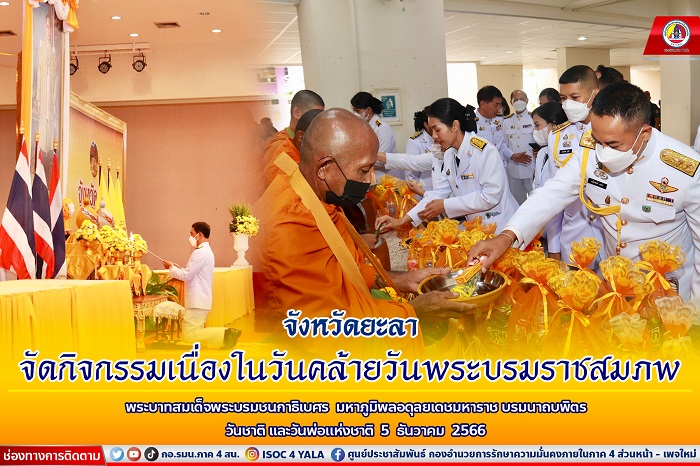 วันนี้ (5 ธันวาคม 2566) เวลา 07.30 น. ณ ห้องประชุมเฉลิมพระเกียรติ 80 พรรษา 5 ธันวาคม 2550 มหาวิทยาลัยราชภัฏยะลา อำเภอเมือง จังหวัดยะลา นายอำพล พงศ์สุวรรณ ผู้ว่าราชการจังหวัดยะลา ประธานในพิธี พร้อมด้วย พลตรี เฉลิมพงค์ คงบัว เลขาธิการกองอำนวยการรักษาความมั่นคงภายในภาค 4 ส่วนหน้า นำข้าราชการ ทหาร ตำรวจ หน่วยงานภาครัฐ ภาคเอกชน เหล่ากาชาดจังหวัดยะลา และพสกนิกรชาวจังหวัดยะลาทุกหมู่เหล่า ร่วมประกอบพิธีทำบุญตักบาตร ถวายเป็นพระราชกุศล เนื่องในวันคล้ายวันพระบรมราชสมภพ พระบาทสมเด็จพระบรมชนกาธิเบศร มหาภูมิพลอดุลยเดชมหาราช บรมนาถบพิตร วันชาติ และวันพ่อแห่งชาติ 5 ธันวาคม 2566 เพื่อน้อมรำลึกในพระมหากรุณาธิคุณของพระบาทสมเด็จพระบรมชนกาธิเบศร มหาภูมิพลอดุลยเดชมหาราช บรมนาถบพิตร