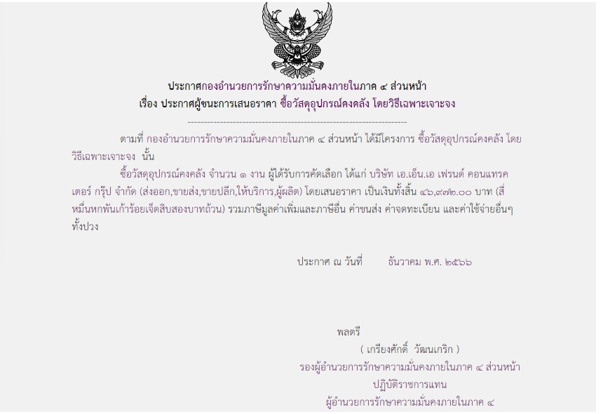 ประกาศผู้ชนะการเสนอราคา ซื้อวัสดุอุปกรณ์คงคลัง โดยวิธีเฉพาะเจาะจง