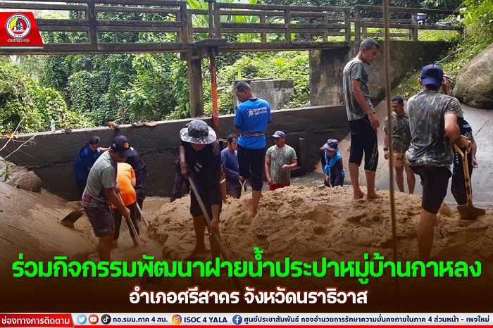 วันที่ 11 ธันวาคม 2566 เวลา 09.00 น. ณ ฝายน้ำประปาบ้านกาหลง หมู่ที่ 1 ตำบลกาหลง อำเภอศรีสาคร จังหวัดนราธิวาส หน่วยเฉพาะกิจกรมทหารพรานที่ 49 โดยร้อยตรี มีชัย นุ่นเหลือ รองผู้บังคับกองร้อยทหารพรานที่ 4909 พร้อมด้วยกำลังพลชุดปฏิบัติการกิจการพลเรือน ร่วมกิจกรรมพัฒนาฝายน้ำประปาหมู่บ้าน ร่วมกับ นายสมชาย แก้วเขียว กำนันตำบลกาหลง, ผู้นำชุมชน, เจ้าหน้าที่อาสาสมัครชุดคุ้มครองตำบลกาหลง และประชาชนในพื้นที่ พัฒนาปรับภูมิทัศบริเวณต้นน้ำ และฝายชะลอน้ำ เพื่อป้องกันและแก้ไขปัญหาน้ำท่วมน้ำแล้ง และมีน้ำใช้อย่างยั่งยืนในชุมชน