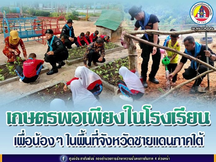 หน่วยเฉพาะกิจกรมทหารพรานที่ 47 จัดกำลังพลของหน่วย เข้าพบปะพูดคุยกับบุคลากรทางการศึกษาของโรงเรียนในพื้นที่รับผิดชอบของหน่วย เพื่อให้ความรู้เกี่ยวกับการทำเกษตรพอเพียงภายในโรงเรียน เพื่อน้อง ๆ เพื่อนำไปต่อยอดในโครงการเศรษฐกิจพอเพียงในสถานศึกษาต่อไป ตลอดจนเพื่อเป็นการส่งเสริมให้ครูและนักเรียนรู้จักใช้พื้นที่ว่างเปล่าให้เกิดประโยชน์ รวมทั้งให้ความรู้การทำเกษตรพอเพียงภายในโรงเรียน การปลูกผักปลอดสารพิษ การเลี้ยงไก่ เลี้ยงปลา เป็นการสร้างรายได้ลดรายจ่ายโครงการอาหารกลางวันของโรงเรียนและเด็ก ๆ ได้รับประทานอาหารที่เป็นประโยชน์ต่อร่างกาย ทั้งนี้ กำลังพลของหน่วยได้สาธิตทำเกษตรพอเพียง เพื่อให้นักเรียนได้เข้าใจถึงขั้นตอนต่าง ๆ ในแปลงเกษตรสาธิตของโรงเรียน โดยทางหน่วยได้ดำเนินตามโครงการเศรษฐกิจพอเพียงในสถานศึกษา จำนวน 5 โรงเรียน ประกอบด้วย