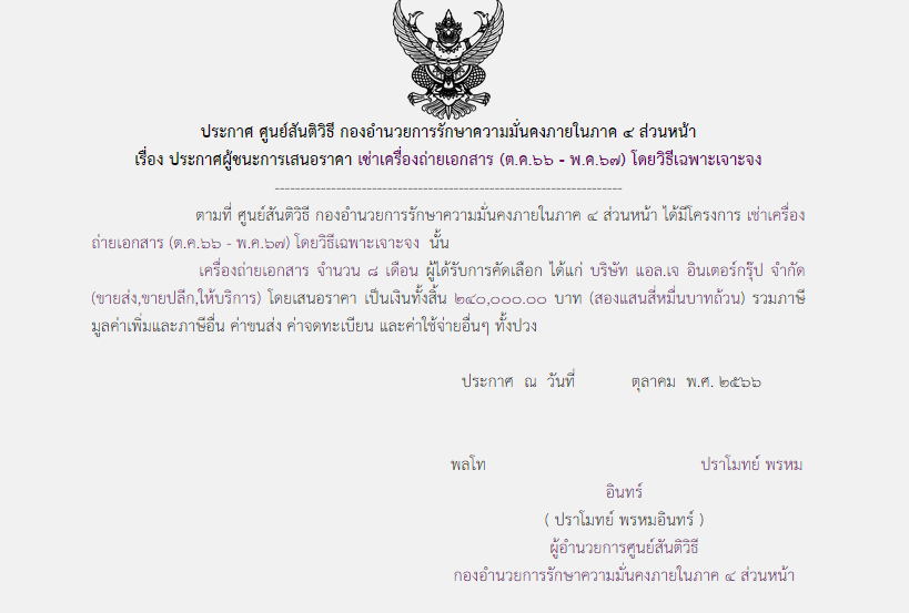 ประกาศผู้ชนะการเสนอราคา เช่าเครื่องถ่ายเอกสาร (ต.ค.๖๖ – พ.ค.๖๗) โดยวิธีเฉพาะเจาะจง