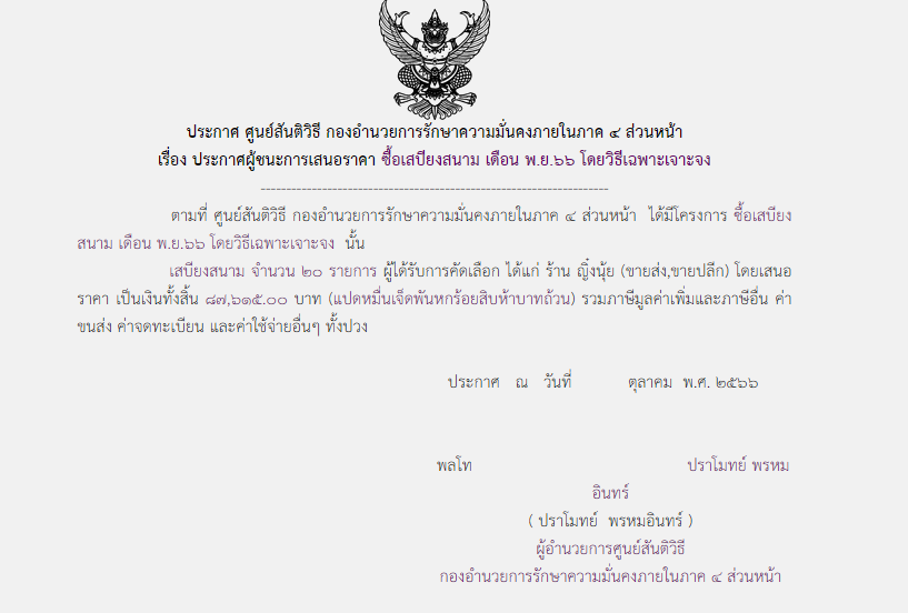 จัดซื้อ จัดจ้างประกาศผู้ชนะการเสนอราคา ประกาศผู้ชนะการเสนอราคา ซื้อเสบียงสนาม เดือน พ.ย.๖๖ โดยวิธีเฉพาะเจาะจง December 14, 2023 472 Share Facebook Twitter Google+ Telegram LINE
