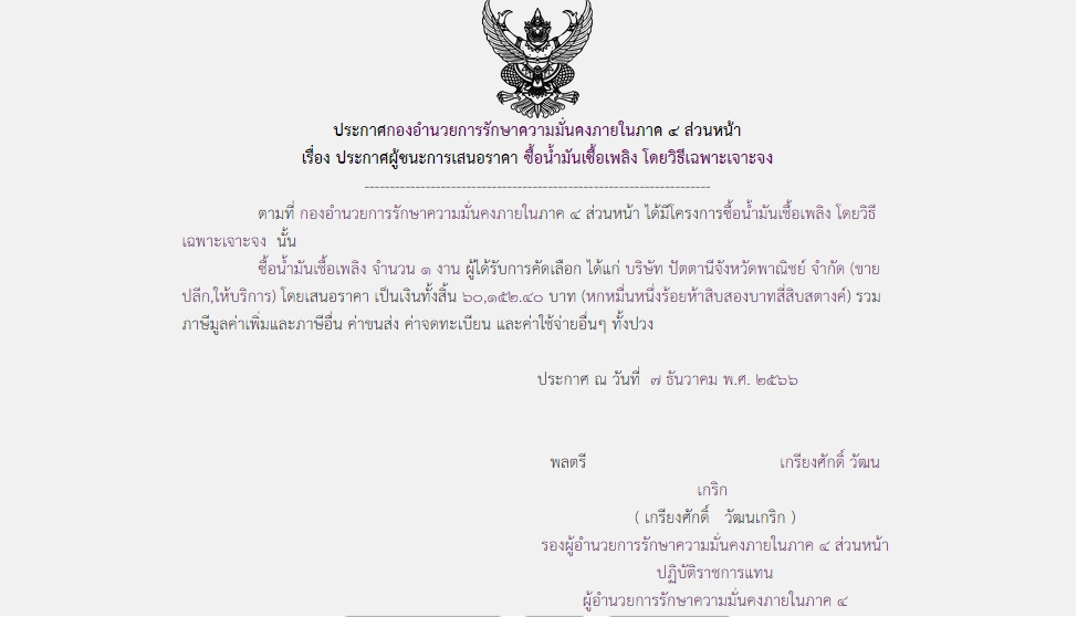 ประกาศผู้ชนะการเสนอราคา ซื้อน้ำมันเชื้อเพลิง โดยวิธีเฉพาะเจาะจง