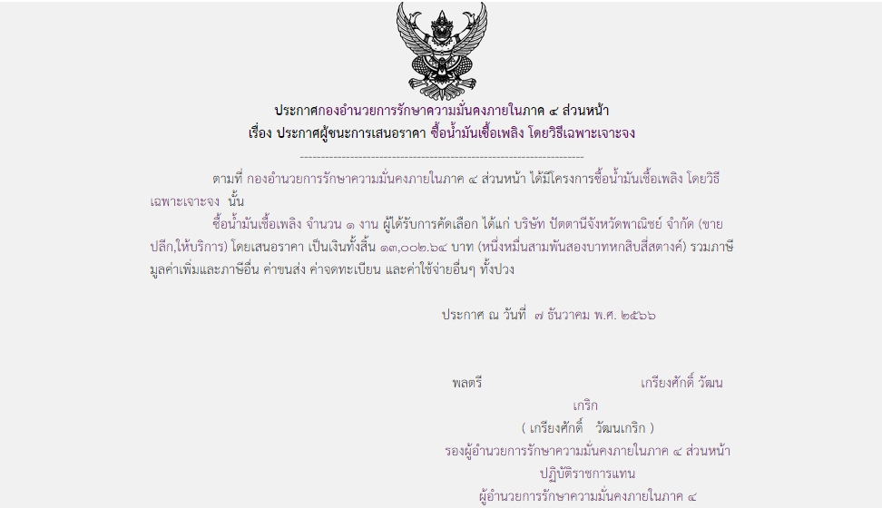 ประกาศผู้ชนะการเสนอราคา ซื้อน้ำมันเชื้อเพลิง โดยวิธีเฉพาะเจาะจง