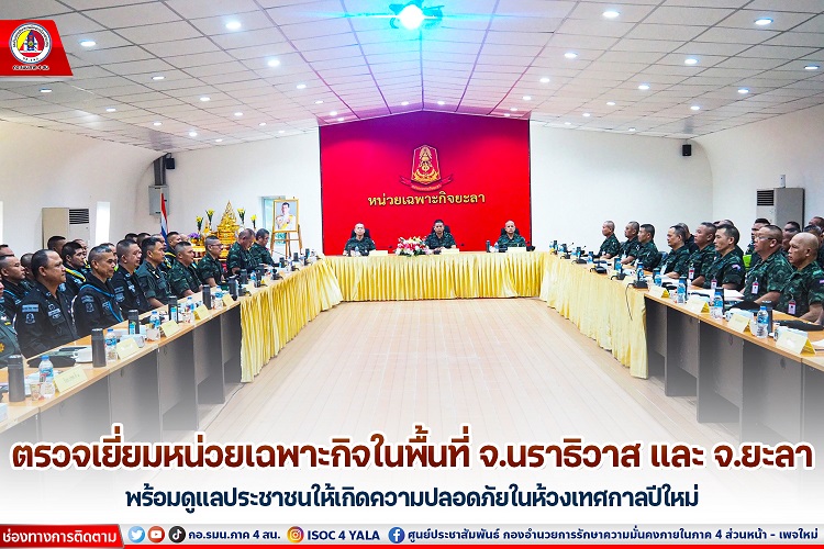เมื่อวันนี้ (16 ธันวาคม 2566) เวลา 08.30 น. พลตรี ไพศาล หนูสังข์ รองแม่ทัพภาคที่ 4 / รองผู้อำนวยการรักษาความมั่นคงภายในภาค 4 ส่วนหน้า และคณะฯ ลงพื้นที่ตรวจเยี่ยมการปฏิบัติงานและให้กำลังใจเจ้าหน้าที่ หน่วยเฉพาะกิจนราธิวาส และหน่วยเฉพาะกิจยะลา ตลอดจนสอบถามปัญหา ข้อขัดข้อง และมอบนโยบายแนวทางในการปฏิบัติหน้าที่ให้เกิดประสิทธิภาพมากที่สุด โดยมี พลตรี เฉลิมพร ขำเขียว ผู้บังคับหน่วยเฉพาะกิจนราธิวาส, พลตรี นิติ ติณสูลานนท์ ผู้บังคับหน่วยเฉพาะกิจยะลา, ผู้บังคับบัญชา ตลอดจนกำลังพลร่วมให้การต้อนรับและเข้าร่วมประชุมฯ