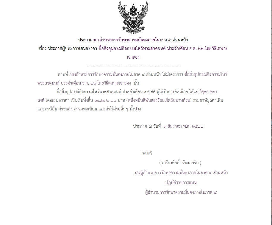 ประกาศผู้ชนะการเสนอราคา ซื้อสิ่งอุปกรณ์กิจกรรมไหว้พระสวดมนต์ ประจำเดือน ธ.ค. ๖๖ โดยวิธีเฉพาะเจาะจง