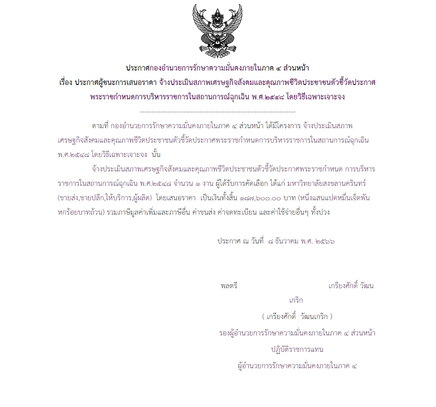 จัดซื้อ จัดจ้างประกาศผู้ชนะการเสนอราคา ประกาศผู้ชนะการเสนอราคา จ้างประเมินสภาพเศรษฐกิจสังคมและคุณภาพชีวิตประชาชนตัวชี้วัดประกาศ พระราชกำหนดการบริหารราชการในสถานการณ์ฉุกเฉิน พ.ศ.๒๕๔๘ โดยวิธีเฉพาะเจาะจง December 20, 2023 506 Share Facebook Twitter Google+ Telegram LINE