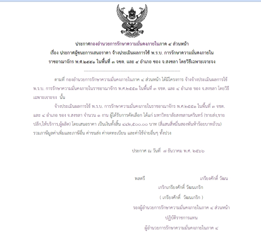 จัดซื้อ จัดจ้างประกาศผู้ชนะการเสนอราคา ประกาศผู้ชนะการเสนอราคา จ้างประเมินผลการใช้ พ.ร.บ. การรักษาความมั่นคงภายในราชอาณาจักร พ.ศ.๒๕๕๑ ในพื้นที่ ๓ จชต. และ ๔ อำเภอ ของ จ.สงขลา โดยวิธีเฉพาะเจาะจง December 20, 2023 297 Share Facebook Twitter Google+ Telegram LINE