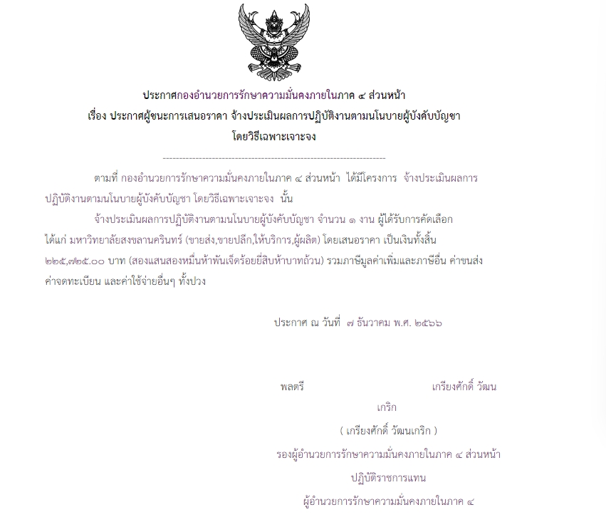 ประกาศผู้ชนะการเสนอราคา จ้างประเมินผลการปฏิบัติงานตามนโนบายผู้บังคับบัญชา โดยวิธีเฉพาะเจาะจง