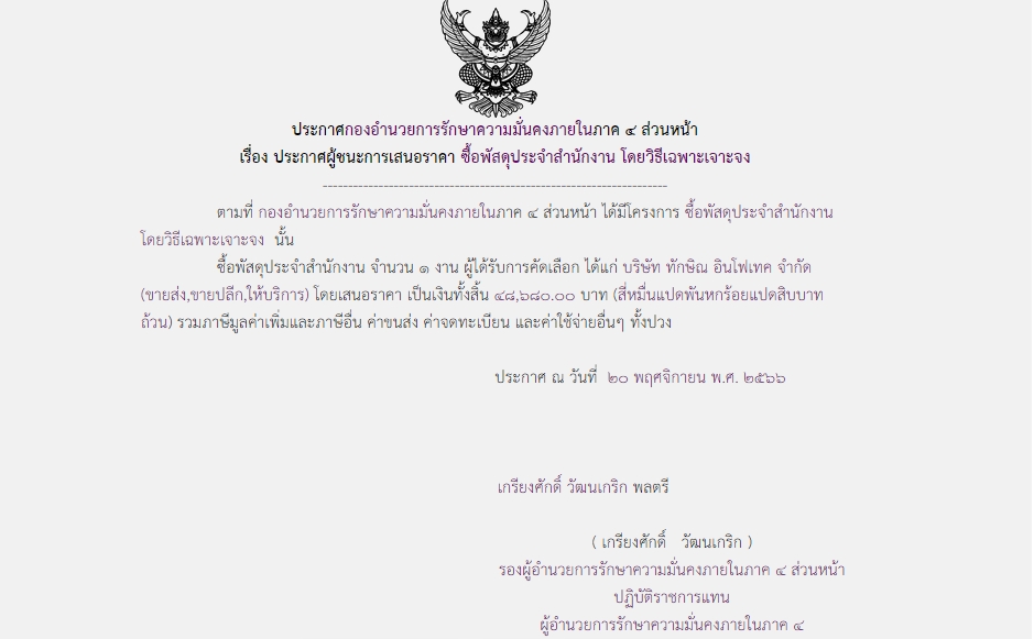 ประกาศผู้ชนะการเสนอราคา ซื้อพัสดุประจำสำนักงาน โดยวิธีเฉพาะเจาะจง
