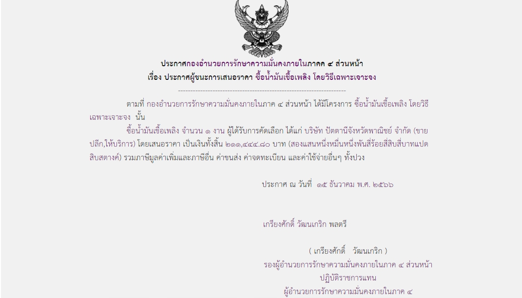 ประกาศผู้ขนะการเสนอราคา ซื้อน้ำมันเชื้อเพลิง โดยวิธีเฉพาะเจาะจง