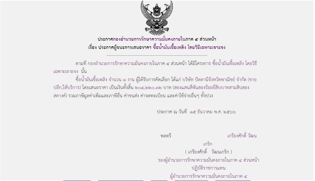 ประกาศผู้ขนะการเสนอราคา ซื้อน้ำมันเชื้อเพลิง โดยวิธีเฉพาะเจาะจง