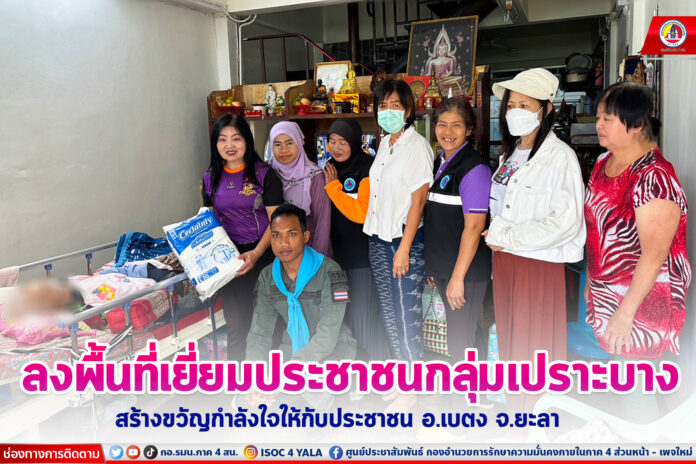 วันที่ 23 ธันวาคม 2566 เวลา 13.00 น. ชุดปฏิบัติการกิจการพลเรือน กองร้อยหน่วยเฉพาะกิจตำรวจตระเวนชายแดนที่ 445 ร่วมกับเจ้าหน้าที่อาสาสมัครสาธารณสุขประจำหมู่บ้าน (อสม.) ลงพื้นที่ไปยังเทศบาลเมืองเบตง อำเภอเบตง จังหวัดยะลา เพื่อเข้าเยี่ยมและให้กำลังใจประชาชนกลุ่มเปราะบางซึ่งเป็นผู้ป่วยติดเตียง พร้อมทั้งได้มอบผ้าอ้อมผู้ใหญ่ให้กับครอบครัว จำนวน 2 ราย ประกอบด้วย นางสาวนีซา ดีสะเอะ อายุ 22 ปี เป็นผู้ป่วยติดเตียงและพิการ อาศัยอยู่บ้านเลขที่ 110/5 ถนนจันทโรทัย ตำบลเบตง อำเภอเบตง จังหวัดยะลา ซึ่งปัจจุบันมีครอบครัวคอยดูแล และนางเล่าเซ็กหยู้ แซ่เล่า อายุ 93 ปี เป็นผู้ป่วยติดเตียง ไม่มีสัญชาติ อาศัยอยู่บ้านเลขที่ 24/1 ถนนสฤษดิ์เดช ตำบลเบตง อำเภอเบตง จังหวัดยะลา