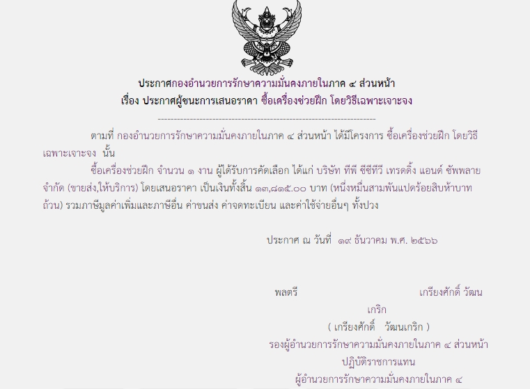 ประกาศผู้ชนะการเสนอราคา ซื้อเครื่องช่วยฝึก โดยวิธีเฉพาะเจาะจง