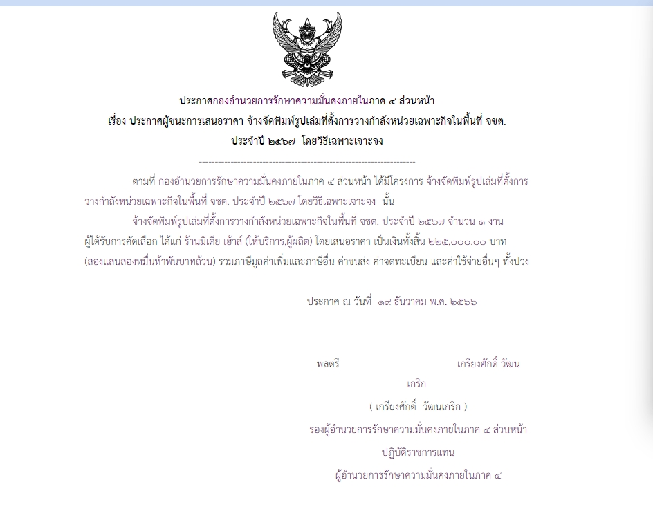 จัดซื้อ จัดจ้างประกาศผู้ชนะการเสนอราคา ประกาศผู้ชนะการเสนอราคา จ้างจัดพิมพ์รูปเล่มที่ตั้งการวางกำลังหน่วยเฉพาะกิจในพื้นที่ จชต. ประจำปี ๒๕๖๗ โดยวิธีเฉพาะเจาะจง December 27, 2023 337 Share Facebook Twitter Google+ Telegram LINE