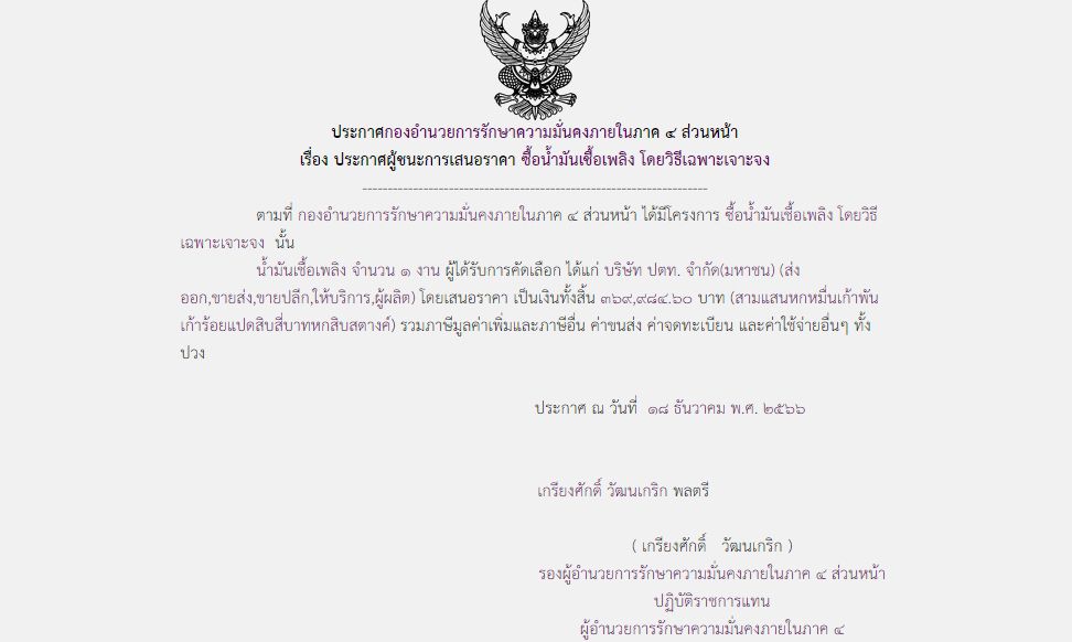ประกาศผู้ชนะการเสนอราคา ซื้อน้ำมันเชื้อเพลิง โดยวิธีเฉพาะเจาะจง