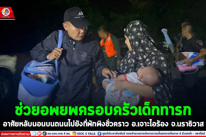 เมื่อวันที่ 27 ธันวาคม 2566 เวลา 19.00 น. พันเอก ถนอมพงษ์ เรืองจันทร์ ผู้บังคับหน่วยเฉพาะกิจกรมทหารพรานที่ 48 ร่วมกับผู้บังคับกองพันทหารราบที่ 3 กรมทหารราบที่ 151 พร้อมด้วยกำลังพล นำอาหารปรุงสุก พร้อมทั้งมอบสิ่งของอุปโภค บริโภค และยารักษาโรค แจกจ่ายให้แก่ผู้ประสบอุกภัยที่น้ำท่วมบ้านจนต้องอพยพขึ้นมาอาศัยหลับนอนอยู่บนถนน บริเวณ บ้านปิเหล็ง ตำบลมะรือโบออก อำเภอเจาะไอร้อง จังหวัดนราธิวาส และพบครอบครัวประชาชนที่มีเด็กทารก อายุ 2 เดือนพักอาศัยอยู่บนถนนซึ่งมีความลำบากสำหรับการดูแลเด็กเล็ก จึงให้การช่วยเหลือเร่งด่วนโดยจัดหาที่พักพิงชั่วคราวที่ปลอดภัยแก่เด็ก และช่วยขนย้ายสิ่งของเครื่องใช้ไปยังที่พักพิงชั่วคราว เพื่อเลี่ยงสภาพอากาศลมฝน และสัตว์มีพิษที่จะเป็นอันตรายต่อเด็ก ทั้งนี้ได้มอบนมผงสำหรับเด็กให้กับครอบครัว ช่วยเหลือบรรเทาความเดือดร้อนแก่ประชาชนในยามวิกฤต