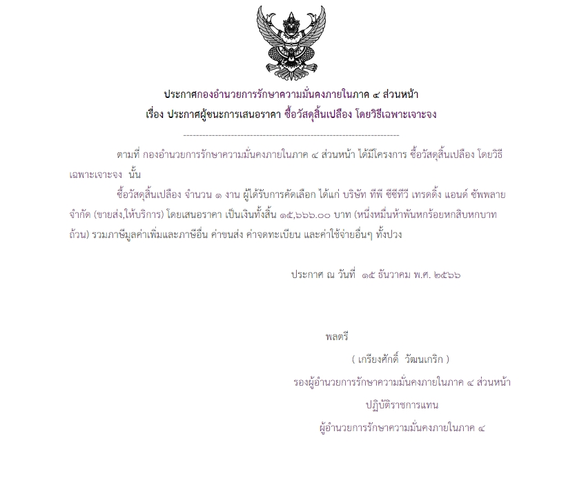 ประกาสผู้ชนะการเสนอราคา ซื้อวัสดุสิ้นเปลือง โดยวิธีเฉพาะเจาะจง