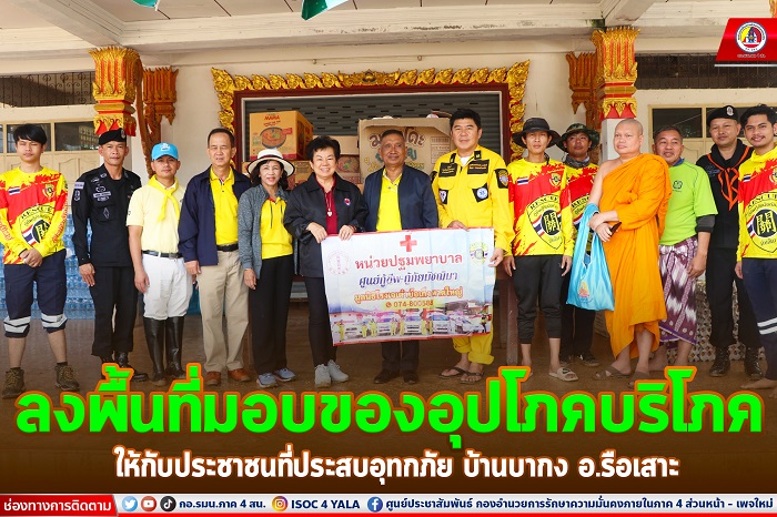 เมื่อวันที่ 28 ธันวาคม 2566 เวลา 12.30 น. พลเอก มณี จันทร์ทิพย์ ที่ปรึกษา กองอำนวยการรักษาความมั่นคงภายในภาค 4 ส่วนหน้า พร้อมคณะ เดินทางมามอบสิ่งของเครื่องอุปโภคบริโภค, ยารักษาโรค และน้ำดื่มให้แก่ประชาชนที่ประสบอุทกภัยในพื้นที่บริเวณรอบๆ วัดทรายทอง บ้านบากง หมู่ที่ 6 ตำบลรือเสาะ อำเภอรือเสาะ จังหวัดนราธิวาส เพื่อบรรเทาความเดือดร้อนหลังน้ำลด โดยมี พันเอก นพดล พรหมมาก รองผู้บังคับหน่วยเฉพาะกิจกรมทหารพรานที่ 46 ร่วมให้การต้อนรับ