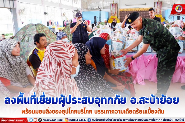 เมื่อวันที่ 29 ธันวาคม 2566 เวลา 15.00 น. พลตรี อภินันท์ แจ่มแจ้ง ผู้บังคับหน่วยเฉพาะกิจสงขลา พร้อมด้วยหัวหน้าส่วนราชการ, ผู้นำท้องที่, มวลชนกลุ่มอาสาเเก้ปัญหาและพัฒนาพื้นที่ ลงพื้นที่ไปยังศูนย์พักพิงชั่วคราวของผู้ประสบอุทกภัย โรงเรียนสะบ้าย้อย หมู่ที่ 1 ตำบลสะบ้าย้อย อำเภอสะบ้าย้อย จังหวัดสงขลา เพื่อพบปะเยี่ยมเยียนให้กำลังใจ พร้อมมอบสิ่งของอุปโภคบริโภคให้กับประชาชนผู้ได้รับผลกระทบจากอุทกภัยในพื้นที่ตำบลสะบ้าย้อย เป็นการบรรเทาความเดือดร้อนในเบื้องต้น ตลอดจนสร้างขวัญกำลังใจที่ดีให้กับประชาชน พร้อมทั้งได้แนะนำวิธีการดูแลรักษาสุขภาพในช่วงฤดูฝน ซึ่งทางหน่วยเฉพาะกิจสงขลายังคงให้ความช่วยเหลือประชาชนที่ได้รับผลกระทบจากอุทกภัยอย่างต่อเนื่อง ตลอด 24 ชั่วโมง