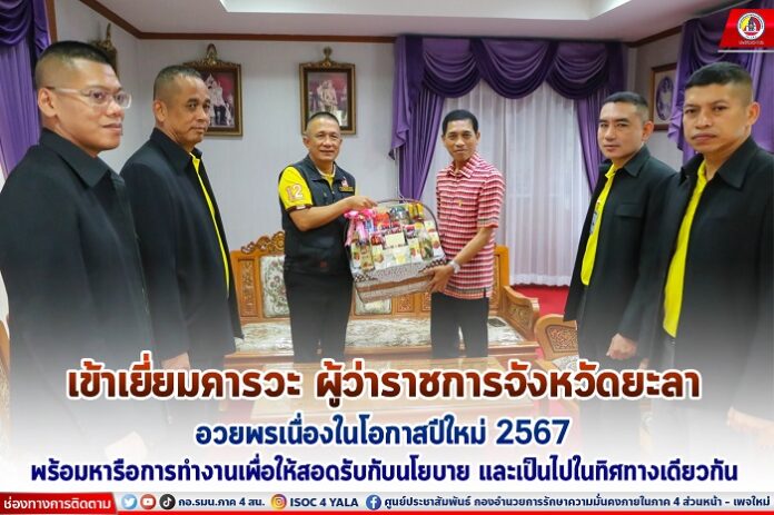 เมื่อวันนี้ 30 ธันวาคม 2566 เวลา 10.00 น. ณ ห้องรับรอง จวนผู้ว่าราชการจังหวัดยะลา อำเภอเมือง จังหวัดยะลา พลโท ปราโมทย์ พรหมอินทร์ แม่ทัพน้อยที่ 4 / รองผู้อำนวยการรักษาความมั่นคงภายในภาค 4 ส่วนหน้า / ผู้อำนวยการศูนย์สันติวิธี พร้อมคณะ เข้าเยี่ยมคารวะ นายอำพล พงศ์สุวรรณ ผู้ว่าราชการจังหวัดยะลา เนื่องในโอกาสขึ้นปีใหม่ 2567 และถือโอกาสแนะนำคณะทำงาน รวมถึงร่วมพูดคุยหารือถึงทิศทางการทำงาน เพื่อให้สอดรับกับนโยบาย และเป็นไปในทิศทางเดียวกัน ทั้งเรื่องการรักษาความปลอดภัย งานการแก้ไขปัญหายาเสพติด รวมทั้งงานการพัฒนาต่างๆ เพื่อให้ประชาชนมีความปลอดภัย มีคุณภาพชีวิตที่ดี ภายใต้การทำงานบูรณาการร่วมกันของทุกฝ่าย