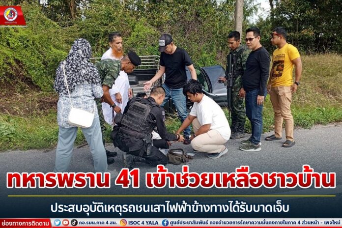 จากเหตุการณ์เมื่อวันที่ 29 ธันวาคม 2566 เวลา 10.00 น. ที่ผ่านมา กองร้อยทหารพรานที่ 4109 กรมทหารพรานที่ 41 จัดกำลังพลหนึ่งชุดปฏิบัติการเข้ารับการฝึกที่ศูนย์ฝึกทางยุทธวิธี อำเภอนาทวี จังหวัดสงขลา นำโดย จ่าสิบเอก กมล ดีเสมอ หัวหน้าชุดปฏิบัติการ จบการฝึกเมื่อวันที่ 29 ธันวาคม 2566 ขณะที่กำลังชุดดังกล่าวได้เดินทางกลับหน่วยต้นสังกัด ในระหว่างเดินทางได้พบรถยานพาหนะของประชาชน เกิดอุบัติเหตุในพื้นที่ บ้านสะกอม อำเภอเทพา จังหวัดสงขลา จึงได้นำกำลังพลเร่งเข้าช่วยเหลือทันที โดยได้ดำเนินการปฐมพยาบาลเบื้องต้นตามยุทธวิธีในการฝึก การช่วยเหลือผู้ประสบภัยเคลื่อนย้ายผู้ป่วย และการประเมินอาการเบื้องต้นให้กับผู้ประสบอุบัติเหตุ และได้ประสานรถกู้ภัยเข้าช่วยเหลือเพื่อนำส่งโรงพยาบาลต่อไป