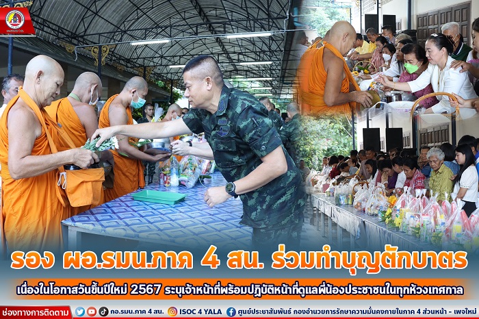 วันนี้ (1 มกราคม 2567) พลตรี ไพศาล หนูสังข์ รองแม่ทัพภาคที่ 4 / รองผู้อำนวยการรักษาความมั่นคงภายในภาค 4 ส่วนหน้า พร้อมคณะและพี่น้องพุทธศาสนิกชนในพื้นที่ ได้ร่วมพิธีทำบุญตักบาตรข้าวสารอาหารแห้ง เนื่องในวันปีใหม่ ณ วัดวงกตบรรพต ตำบลตาชี อำเภอยะหา จังหวัดยะลา เพื่อความเป็นสิริมงคล และดำรงไว้ซึ่งวัฒนธรรมประเพณีอันดีงามของไทย ตลอดจนมุ่งหวังให้ประชาชนมีความสุข ต้อนรับปีใหม่ 2567 โอกาสนี้ ยังได้ร่วมรับประทานอาหาร พบปะพูดคุย กับพี่น้องประชาชนที่เดินทางมาร่วมกิจกรรมด้วยบรรยากาศอบอุ่นและเป็นกันเอง ก่อนจะเดินทางต่อไปยังมัสยิดญามีอุลฟิรดาวซ์ บ้านซีเซะ ตำบลบาโร๊ะ อำเภอยะหา จังหวัดยะลา เพื่อพบปะและมอบถุงยังชีพให้กับผู้ประสบภัยในพื้นที่ พร้อมพบปะให้กำลังใจ ให้ผ่านวิกฤติอุทกภัยครั้งนี้ไปด้วยกัน พร้อมกันนี้ยังได้สร้างความเชื่อมั่นกับพี่น้องประชาชนว่า เจ้าหน้าที่ทุกนายยังคงปฏิบัติหน้าที่ดูแลพี่น้องประชาชนอย่างเต็มกำลังความสามารถในทุกห้วงเทศกาล
