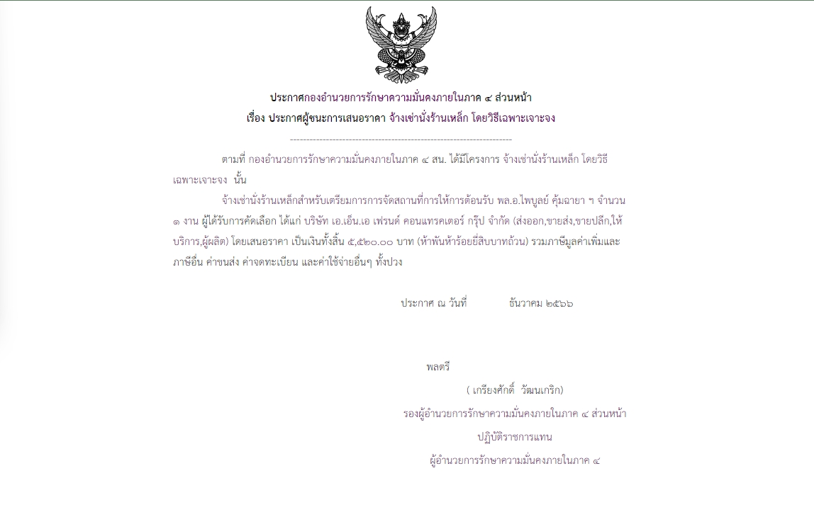 ประกาศผู้ชนะการเสนอราคา จ้างเช่านั่งร้านเหล็ก โดยวิธีเฉพาะเจาะจง