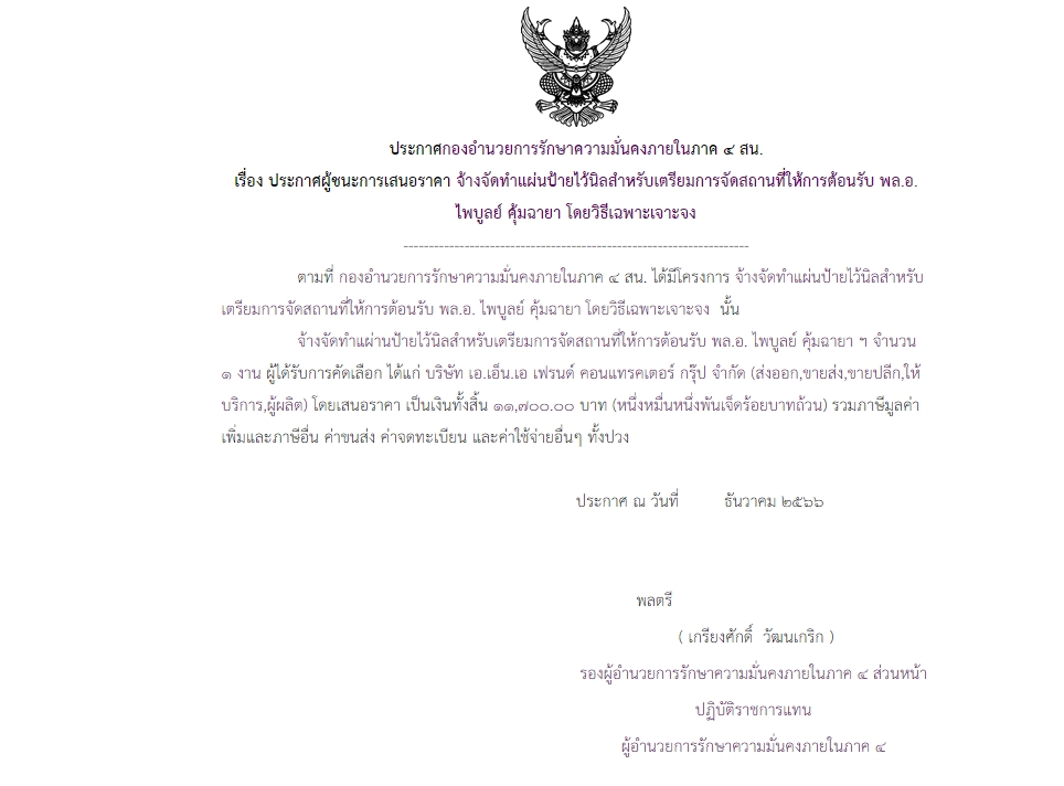 จัดซื้อ จัดจ้างประกาศผู้ชนะการเสนอราคา ประกาศผู้ชนะการเสนอราคา จ้างจัดทำแผ่นป้ายไว้นิลสำหรับเตรียมการจัดสถานที่ให้การต้อนรับ พล.อ. ไพบูลย์ คุ้มฉายา โดยวิธีเฉพาะเจาะจง January 2, 2024 539 Share Facebook Twitter Google+ Telegram LINE