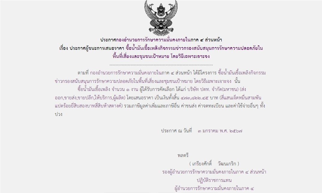 จัดซื้อ จัดจ้างประกาศผู้ชนะการเสนอราคา ประกาศผู้ชนะการเสนอราคา ซื้อน้ำมันเชื้อเพลิงกิจกรรมข่าวกรองสนับสนุนการรักษาความปลอดภัยในพื้นที่เสี่ยงและชุมชนเป้าหมาย โดยวิธีเฉพาะเจาะจง January 3, 2024 476 Share Facebook Twitter Google+ Telegram LINE