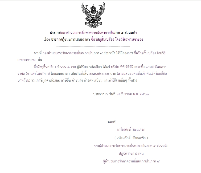 ประกาศผู้ชนะเสนอราคา ซื้อวัสดุสิ้นเปลือง โดยวิธีเฉพาะเจาะจง