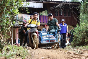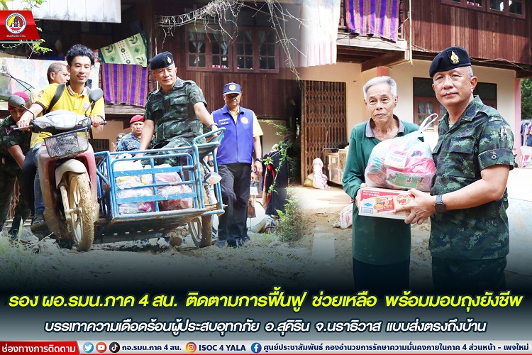 เมื่อวันที่ 3 มกราคม 2567 เวลา 13.30 น. พลโท ปราโมทย์ พรหมอินทร์ แม่ทัพน้อยที่ 4 / รองผู้อำนวยการรักษาความมั่นคงภายในภาค 4 ส่วนหน้า พร้อมคณะ ลงพื้นที่เยี่ยมให้กำลังใจ พร้อมมอบถุงยังชีพที่ได้รับการสนับสนุนจากหน่วยงานกองทัพบก ภาคเอกชน ผู้มีจิตศรัทธา และชมรมพัฒนาสัมพันธ์ระดับผู้บริหารจังหวัดชายแดนภาคใต้ (พสบ.จชต.) ร่วมบริจาค นำไปแจกจ่ายให้กับผู้ประสบภัยพื้นที่อำเภอสุคิริน จังหวัดนราธิวาส แบบส่งตรงถึงบ้าน โดยมี หัวหน้าส่วนราชการ , ผู้บังคับหน่วยเฉพาะกิจในพื้นที่ , ผู้นำท้องที่ , ผู้นำท้องถิ่น และประชาชนผู้ประสบภัยให้การต้อนรับ