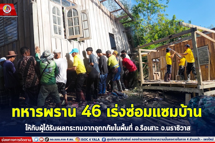 วันที่ 3 มกราคม 2567 เวลา 09.00 น. พันเอก สิทธิชัย บำรุงเขต ผู้บังคับหน่วยเฉพาะกิจกรมทหารพรานที่ 46 จัดกำลังพลจิตอาสาของหน่วย ร่วมกับ นายอุสมาน สา และประชาชนในพื้นที่ ช่วยเหลือประชาชนที่ได้รับผลกระทบจากอุทกภัย ที่บ้านเรือน และทรัพย์สินได้รับความเสียหาย โดยช่วยกันฟื้นฟูซ่อมแซมบ้านเรือน เพื่อที่จะให้สามารถพักอาศัยได้ในเบื้องต้น และจะทำการเข้าช่วยเหลือต่อไปจนกว่าจะพักอาศัยอยู่ได้ตามปกติ ณ บ้านเลขที่ 57/2 บ้านบูวะ (บ้านย่อย บ้านยาแลเบาะ) หมู่ที่ 5 ตำบลอ.รือเสาะ อำเภอรือเสาะ จังหวัดนราธิวาส