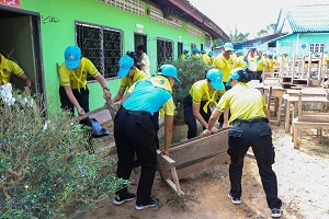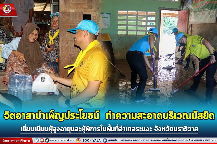 พันเอก สุรศักดิ์ พึ่งแย้ม ผู้บังคับหน่วยเฉพาะกิจกรมทหารพรานที่ 45 พร้อมด้วย คุณกิติมา พึ่งแย้ม ประธานสมาคมแม่บ้านทหารบกสาขา กรมทหารพรานที่ 45 นำกำลังพลจิตอาสาของหน่วย ร่วมกับ ส่วนราชการ ผู้นำหมู่บ้าน และประชาชนจิตอาสาในพื้นที่ ร่วมกิจกรรมจิตอาสาบำเพ็ญประโยชน์ “เราทำความดี ด้วยหัวใจ” ทำความสะอาดบริเวณมัสยิดนูรดีน บ้านบาโงสะโต หมู่ที่ 7 ตำบลบาโงสะโต อำเภอระแงะ จังหวัดนราธิวาส ซึ่งได้รับผลกระทบจากอุทกภัยในห้วงที่ผ่านมา พร้อมทั้งได้มอบอุปกรณ์ทำความสะอาดให้กับประชาชนไว้ใช้งาน โดยมีนายวิมุติ อำนักมณี นายอำเภอระแงะ เป็นประธานในกิจกรรมครั้งนี้