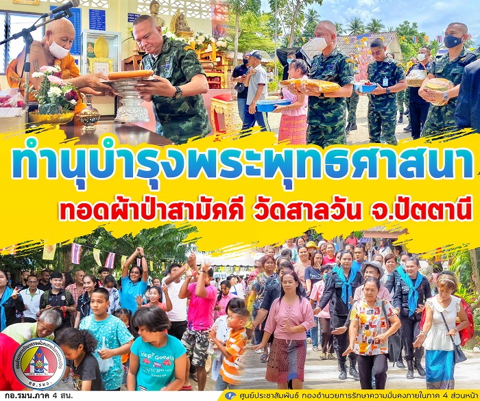 พลตรีคมกฤช รัตนฉายา ผู้บังคับหน่วยเฉพาะกิจปัตตานี เป็นประธานพิธีทอดผ้าป่าสามัคคี วัดสาลวัน (บ้านเคียน) พร้อมด้วยคณะ และประชาชนไทยพุทธผู้มีจิตศรัทธา ร่วมกันเป็นเจ้าภาพทอดผ้าป่าสามัคคี เพื่อเทถนนคอนกรีตเสริมเหล็ก ปูกระเบื้องโรงครัวปรับปรุงรางน้ำ บูรณะซ่อมแซมเสนาสนะและศาสนสถานที่มีสภาพชำรุดทรุดโทรม โดยมี พระครูปัจจันตเขต บริรักษ์ เจ้าคณะตำบลคอกกระบือ/เจ้าอาวาสวัดประจันตคาม เป็นประธานฝ่ายสงฆ์ ในการนี้ ผู้มีจิตศรัทธาเข้าร่วมทอดผ้าป่าสามัคคีประมาณ 350 คน ณ วัดสาลวัน (บ้านเคียน) ตำบลพ่อมิ่ง อำเภอปะนาเระ จังหวัดปัตตานี การทอดผ้าป่าสามัคคี ถือเป็นการทำนุบำรุงพระพุทธศาสนา และสืบสานประเพณีวัฒนธรรมอันดีงามของชาวพุทธ ส่งเสริมอัตลักษณ์ในท้องถิ่น พร้อมแสดงออกถึงความสมัครสมานสามัคคีระหว่างเจ้าหน้าที่กับประชาชน