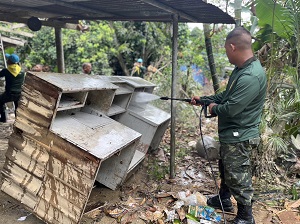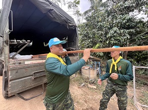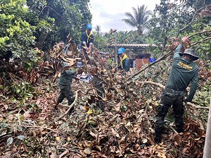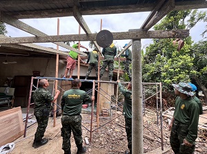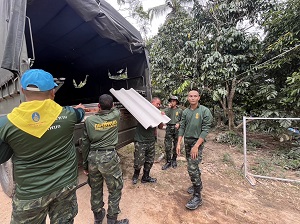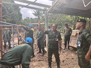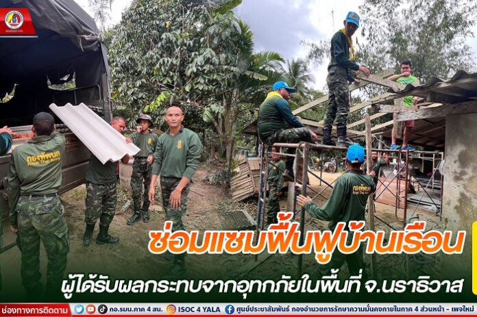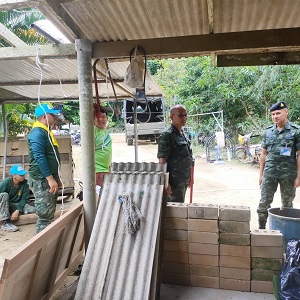 เมื่อวันที่ 5 มกราคม 2567 เวลา 08.30 น. ที่บ้านเลขที่ 97 หมู่ที่ 1 ตำบลลำภู อำเภอเมือง จังหวัดนราธิวาส พันโท ชัยพิพัฒน์ อินทรเทพ ผู้บังคับกองพันทหารราบที่ 1 กรมทหารราบที่ 151 นำกำลังพลหมวดบรรเทาสาธารณภัยฯ จิตอาสาของหน่วย ประสาน องค์การบริหารส่วนตำบลลำภู เพื่อร่วมเข้าช่วยเหลือ นางอ่อน หมวกดำ (ผู้ป่วยติดเตียง) เป็นผู้ปกครอง จ่าสิบเอก กนก หมวกดำ กำลังพลของหน่วย ที่ได้รับความเดือดร้อนจากอุทกภัย ช่วยดำเนินการเปลี่ยนโครงหลังคาและกระเบื้องใหม่ เนื่องจากต้นไม้ล้มทับจนทำให้บ้านได้รับความเสียหาย พร้อมทั้งได้ดำเนินการจัดเก็บขยะมูลฝอยให้กับประชาชน ซึ่งขยะดังกล่าวได้มากับน้ำและติดอยู่ในบ้านประชาชนในพื้นที่เป็นจำนวนมาก ปัจจุบันการดำเนินการเปลี่ยนโครงหลังคาและกระเบื้องใหม่อยู่ระหว่างดำเนินการได้ 50% แล้ว
