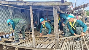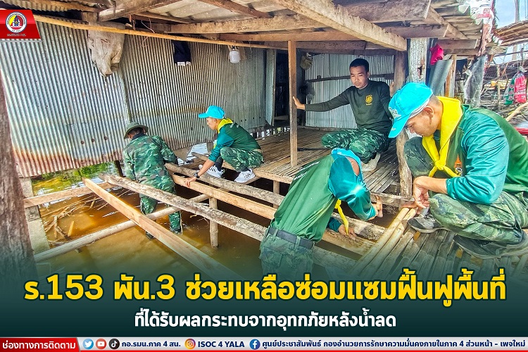 ทั้งนี้ เจ้าหน้าที่ทหารได้ดำเนินการซ่อมแซมบ้านให้กับผู้ประสบภัย โดยอยู่ในขั้นตอนการสำรวจบ้านเรือนที่จะต้องซ่อมแซม จำนวน 2 หลัง ปัจจุบันมีบ้านที่อยู่ระหว่างการซ่อมแซม จำนวน 1 หลัง และได้ดำเนินการซ่อมแซมบ้านเสร็จแล้ว จำนวน 1 หลัง เจ้าหน้าที่ยังคงเร่งดำเนินการให้เร็วที่สุดเพื่อบรรเทาความเดือดร้อนให้กับพี่น้องประชาชน