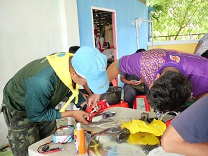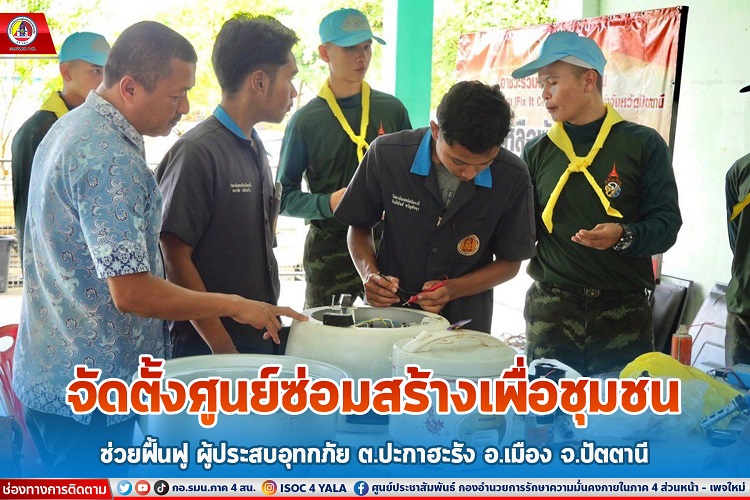 เมื่อวันที่ 5 มกราคม 2567 เวลา 09.00 – 15.30 น. กองพันทหารราบที่ 3 กรมทหารราบที่ 153 จัดกำลังพล ร่วมกับ คณะครู เเละนักศึกษาวิทยาลัยเทคนิคปัตตานี ลงพื้นที่จัดตั้งศูนย์ซ่อมสร้างเพื่อชุมชน ณ โรงเรียนบ้านกือยา ตำบลปะกาฮะรัง อำเภอเมือง จังหวัดปัตตานี เพื่อช่วยเหลือ ฟื้นฟู ซ่อมแซมของใช้ต่าง ๆ ให้กับผู้ประสบอุทกภัยในพื้นที่ตำบลปะกาฮะรัง โดยรับซ่อมเเซม เครื่องใช้ไฟฟ้า เเละยานพาหนะ ที่เสียหายจากน้ำท่วม ให้กับประชาชนที่ได้รับความเดือดร้อนจากอุทกภัยในพื้นที่ใกล้เคียง
