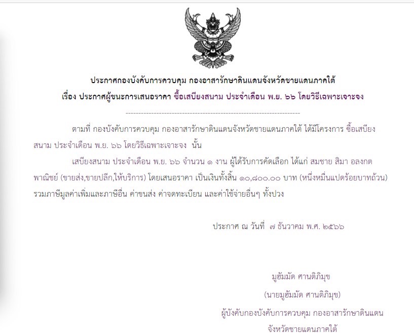 ประกาศผู้ชนะการเสนอราคา ซื้อเสบียงสนาม ประจำเดือน พ.ย.๖๖ โดยวิธีเฉพาะเจาะจง