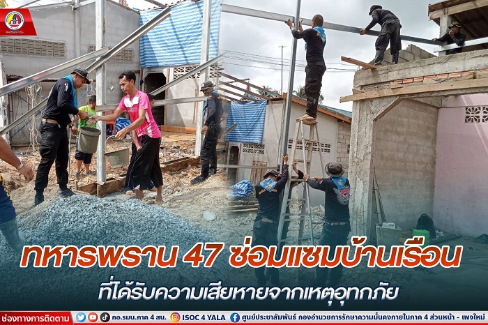 วันนี้ (7 มกราคม 2567) เวลา 09.00 – 12.00 น. หน่วยเฉพาะกิจกรมทหารพรานที่ 47 จัดกำลังพล ร่วมกับ ผู้นำชุมชน กองร้อยอาสารักษาดินแดนอำเภอกรงปินัง สถานีตำรวจภูธรกรงปินัง และเจ้าของผู้พักอาศัย ร่วมซ่อมแซมบ้านเรือนที่ได้รับความเสียหายจากเหตุอุทกภัย จำนวน 4 หลังคาเรือน ในพื้นที่ บ้านกะดูโด๊ะ หมู่ที่ 3 ตำบลสะเอะ อำเภอกรงปินัง จังหวัดยะลา โดยมี พันตรี ทวียศ ศรีสุขสวัสดิ์ ผู้บังคับกองร้อยทหารพรานที่ 4714 เป็นผู้ควบคุมการปฏิบัติ โดยวันนี้ได้ทำการขึ้นโครงหลังคา และเทคาน เจ้าหน้าที่ยังคงเร่งดำเนินการให้เร็วที่สุดเพื่อบรรเทาความเดือดร้อนให้กับพี่น้องประชาชน