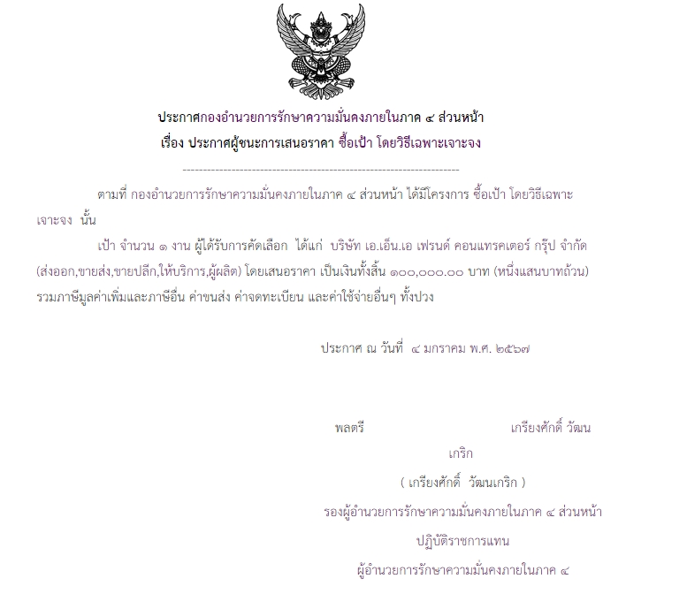 ประกาศผู้ชนะการเสนอราคา ซื้อเป้า โดยวิธีเฉพาะเจาะจง