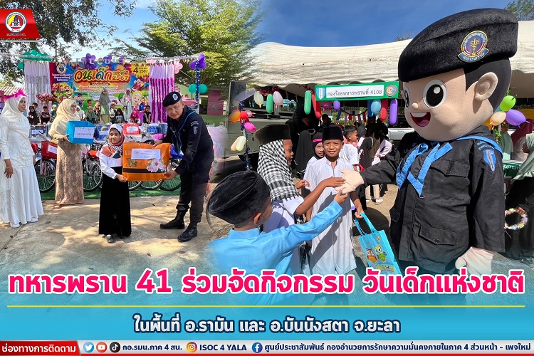 หน่วยเฉพาะกิจกรมทหารพรานที่ 41 โดย ชุดปฏิบัติการกิจการพลเรือน กองร้อยทหารพรานหน่วยขึ้นตรง ร่วมกับ หน่วยงานราชการ, ผู้ปกครอง และประชาชนในพื้นที่ ร่วมกิจกรรมวันเด็กแห่งชาติ ประจำปี 2567 เพื่อสร้างอุดมการความรักชาติ ตามแบบพหุวัฒนธรรมอีกทั้งเป็นการสร้างสัมพันธ์อันดีในการมีส่วนร่วมระหว่าง บุคลากรทางการศึกษา เจ้าหน้าที่รัฐ และประชาชน พร้อมทั้งสนับสนุนรถจักรยาน, ไอศกรีม เป็นของรางวัลให้กับเด็กนักเรียน ในพื้นที่ อำเภอรามัน และ อำเภอบันนังสตา จังหวัดยะลา
