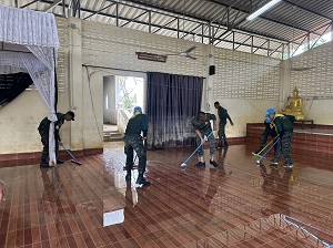 วันที่ 8 มกราคม 2567 ที่ วัดทรายทอง บ้านบากง ตำบลรือเสาะ อำเภอรือเสาะ จังหวัดนราธิวาส กองพันทหารราบที่ 1 กรมทหารราบที่ 151 พร้อมด้วยกำลังพลจิตอาสาของหน่วย พร้อมด้วยรถบรรทุกน้ำ ขนาด 6,000 ลิตร ร่วมกับ หน่วยเฉพาะกิจกรมทหารพรานที่ 46, ผู้นำหมู่บ้าน คณะกรรมการวัด ลงพื้นที่ให้ความช่วยเหลือเจ้าอาวาสวัดทรายทอง โดยการทำความสะอาด ขัดล้างดินโคลน ออกจากองค์พระพุทธรูปและอุโบสถ ศาลาการเปรียญ ศาลาสวดอภิธรรม ห้องสุขา เพื่อฟื้นฟูซ่อมแซมศาสนสถานที่ได้รับผลกระทบจากเหตุอุทกภัยในห้วงที่ผ่านมา ให้กลับเข้าสู่สภาวะปกติ