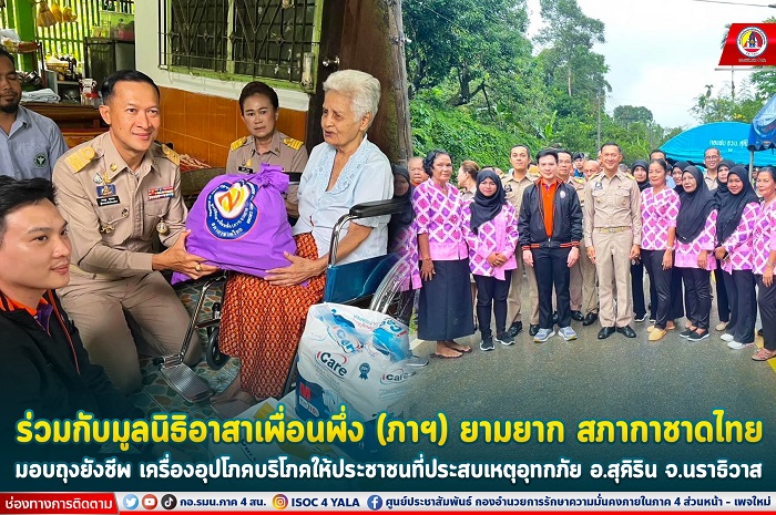 เมื่อวันที่ 9 มกราคม 2567 เวลา 13.00 น. หน่วยเฉพาะกิจกรมทหารพรานที่ 49 โดย ร้อยโท อัครายุทธ ศรีดาโคตร ผู้บังคับกองร้อยทหารพรานที่ 4908 พร้อมด้วย กำลังพล ชุดปฏิบัติการกิจการพลเรือนของหน่วย ร่วมกับหน่วยงานส่วนราชการ ,จิตอาสา ,กลุ่มแม่บ้าน ,กำนัน, ผู้ใหญ่บ้าน ให้การต้อนรับ ว่าที่ร้อยตรี ตระกูล โทธรรม ผู้ว่าราชการจังหวัดนราธิวาส และมูลนิธิอาสาเพื่อนพึ่ง (ภาฯ) ยามยาก สภากาชาดไทย ลงพื้นที่มอบถุงยังชีพ เครื่องอุปโภคบริโภคเพื่ออำนวยความสะดวก ช่วยเหลือประชาชนในพื้นที่ที่ประสบเหตุอุทกภัย พร้อมทั้งมอบเงินเยียวยา และพบปะให้กำลังใจพี่น้องประชาชน ณ บ้านร่วมใจ หมู่ที่ 5 ตำบลร่มไทร อำเภอสุคิริน จังหวัดนราธิวาส